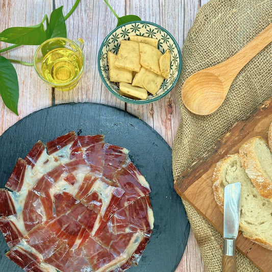 Jamón de Bellota ibérico 50% raza ibérica corte tradicional 28 sobres+puntas+huesos